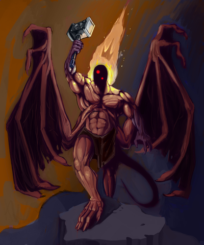 Betelgeuse is often depicted as a muscular, reptilian humanoid with leathery wings and a tail. His face is absent, in it's place is a shadowy window into his realm. He wields a hammer with a humanoid skull on it, which also serves as his symbol.